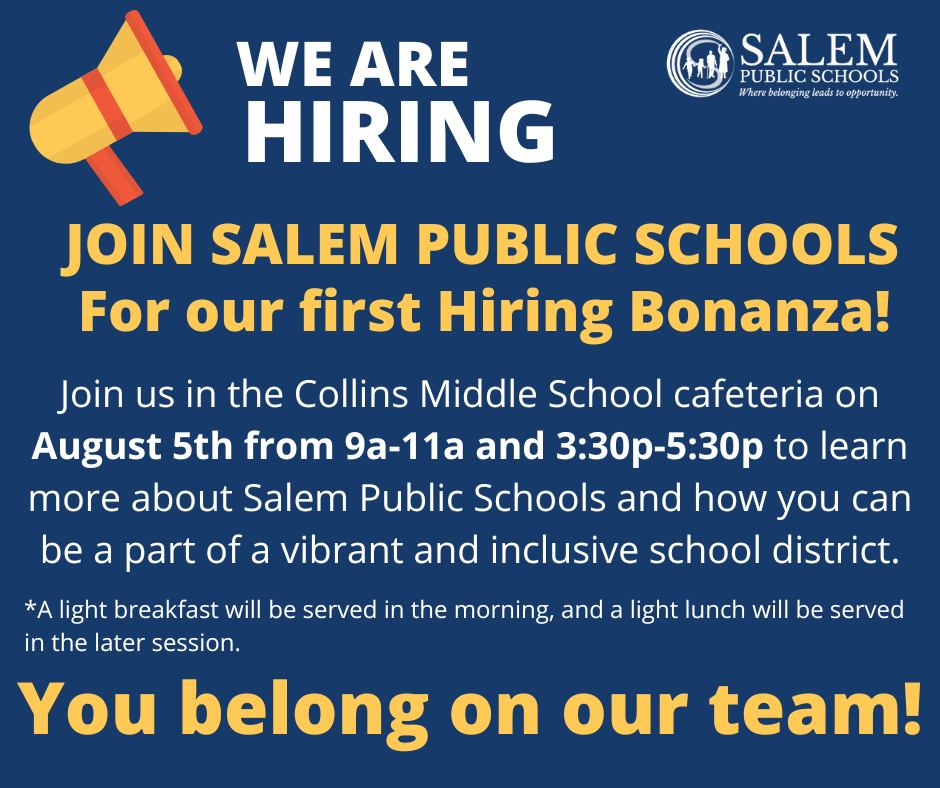 Salem is a vibrant and historic community with a diverse population. We are looking for you and others to join us to provide a supportive and thriving environment for our students, families, and staff.