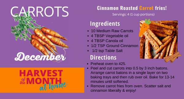 Hello from Salem Food and Nutrition services! This month as part of the Farm to School Harvest of the month program, our featured Harvest for the month of December is Carrots! Carrots will be featured on our menus throughout this month. Fact sheets about carrots have been distributed throughout our schools to promote learning about the nutritional value of carrots. “Cinnamon Roasted Carrot Fries” will be served as a side on our menu later this month, and here is the recipe we will be using. Try making it at home!