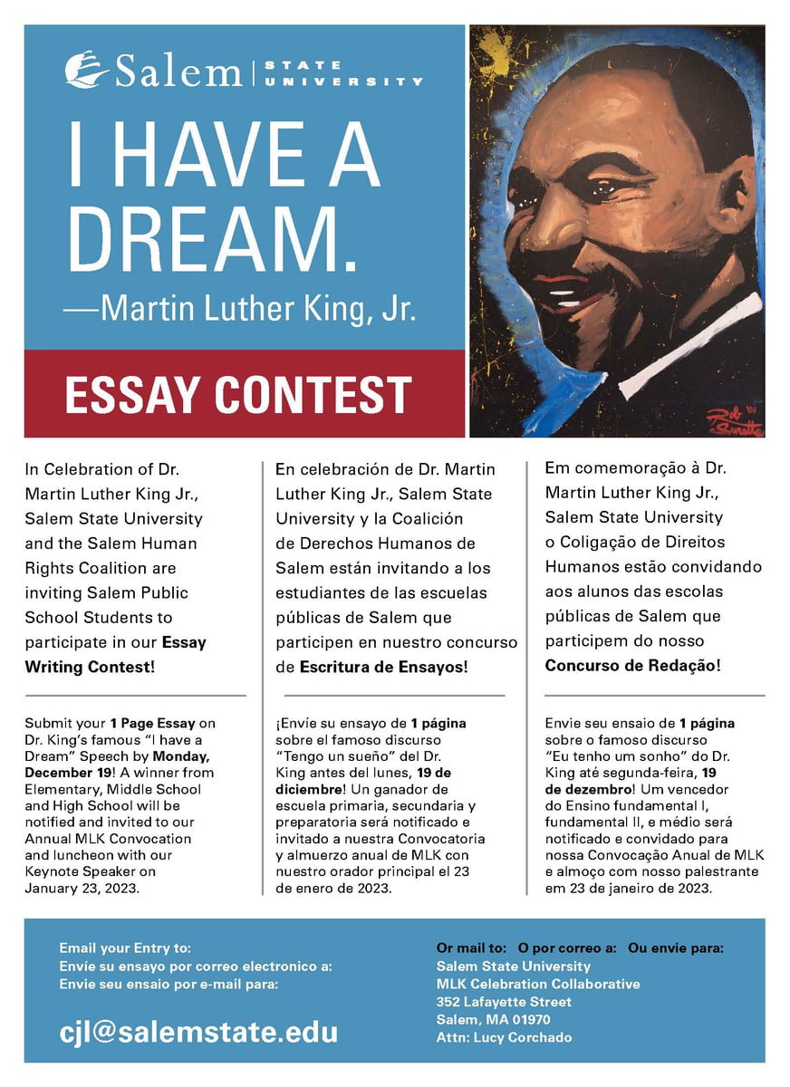 In celebration of Dr. Martin Luther King Jr., Salem State University and the Salem Human Rights Coalition are inviting Salem Public School students to participate in an essay writing contest!