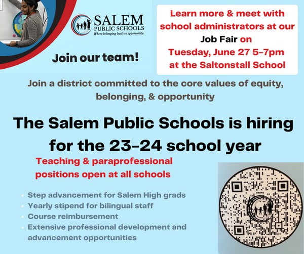 Salem Public School District is committed to maintaining a work and learning environment free from discrimination on the basis of race, color, religion, national origin, pregnancy, gender identity, sexual orientation, marital/civil union status, ancestry, place of birth, age, citizenship status, veteran status, political affiliation, genetic information or disability, as defined and required by state and federal laws.