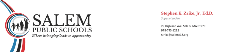 Salem Public Schools will have a regular school day. All outdoor activities will be replaced with indoor alternatives. This includes recess. We encourage all families to wear weather-appropriate clothing, including hats and gloves. If students are in need of winter clothing, please reach out to your school’s main office or the City Connects staff member at each school.